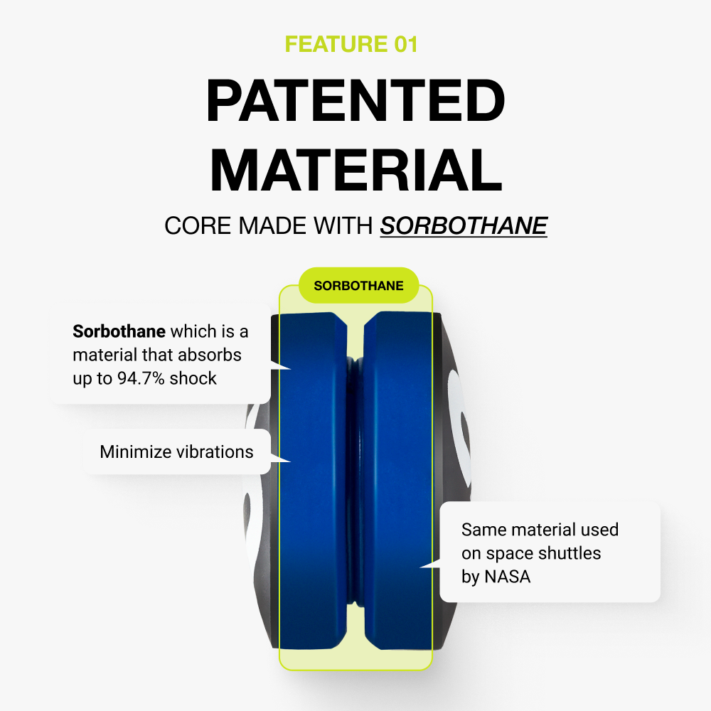 These benefits come from the patented shock-absorbing and vibration-blocking material, ‘Sorbothane’, designed to reduce the physical strain and discomfort often experienced during sports and physical activities.